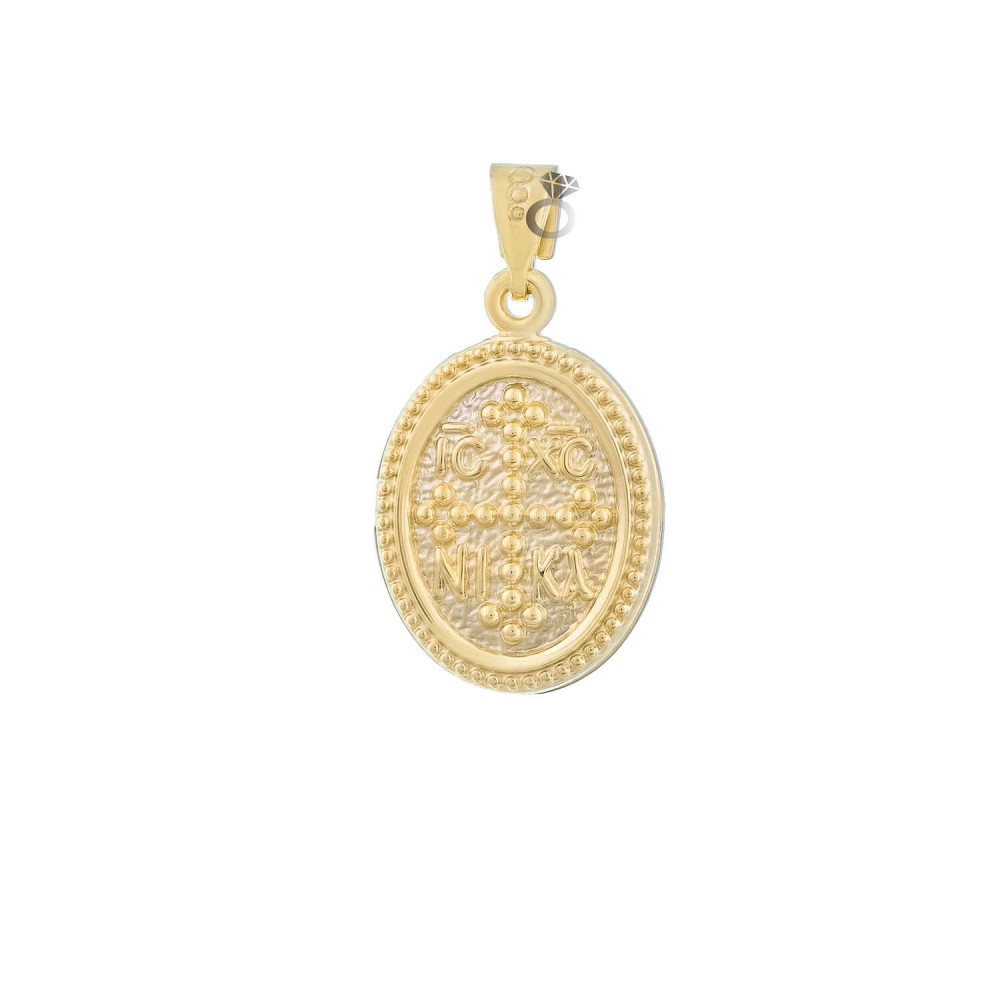 Χρυσό φυλαχτό 9 καρατίων από κίτρινο χρυσό , με τo IC XC NIKA στην πρώτη όψη & κωνσταντινάτο στη δεύτερη όψη .