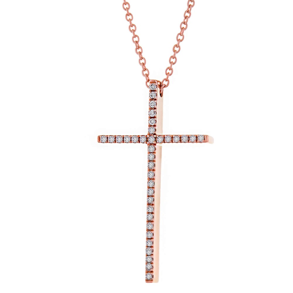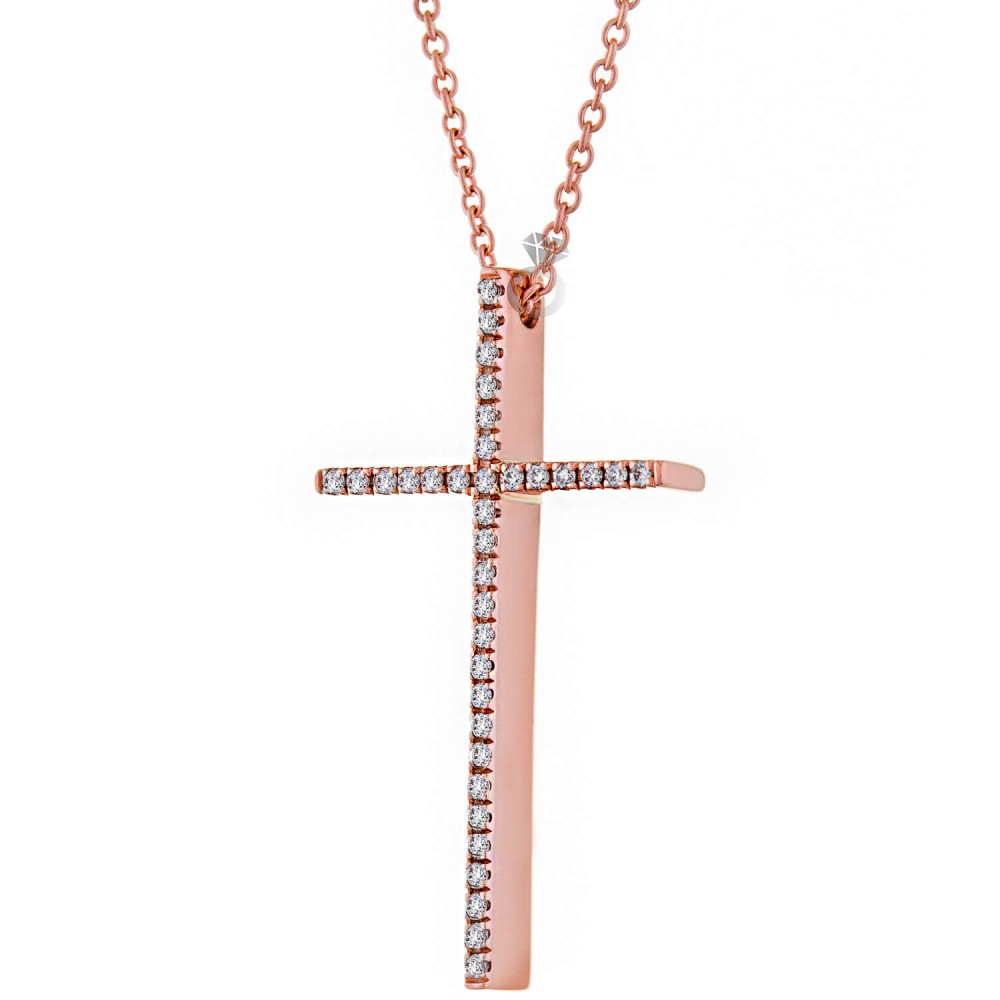 Γυναικείος σταυρός , σε ροζ χρυσό 18 καρατίων , με Διαμάντια κοπής μπριγιάν . Συνοδεύεται από ροζ χρυσή αλυσίδα 18 καρατίων .