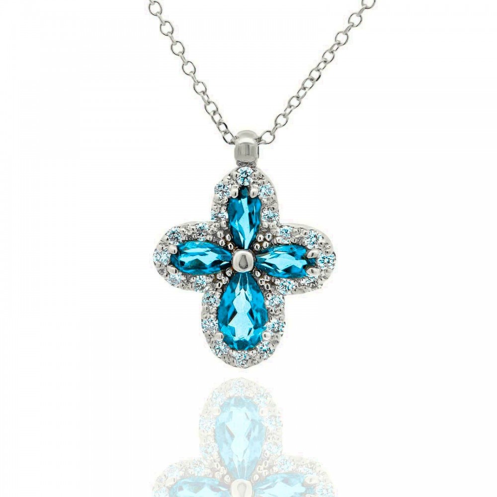 Λευκός χρυσός γυναικείος σταυρός 14 καρατίων , με swiss blue topaz LC μεγέθους 0,52Ct και διαμάντια μεγέθους 0,11Ct  .