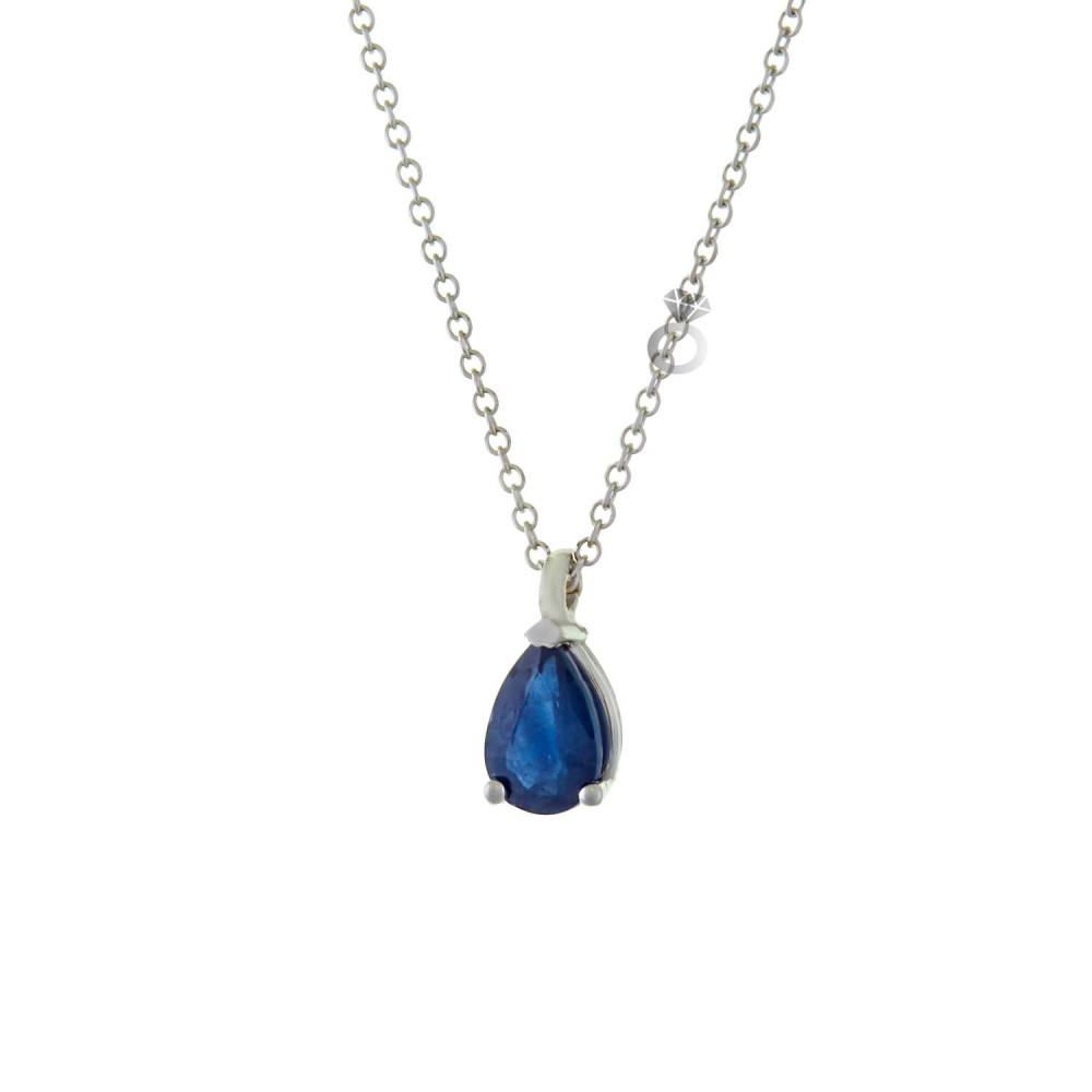 Ένα μονόπετρο κολιέ σε σχήμα δάκρυ από λευκό χρυσό 14 καρατίων και ορυκτό ζαφείρι .