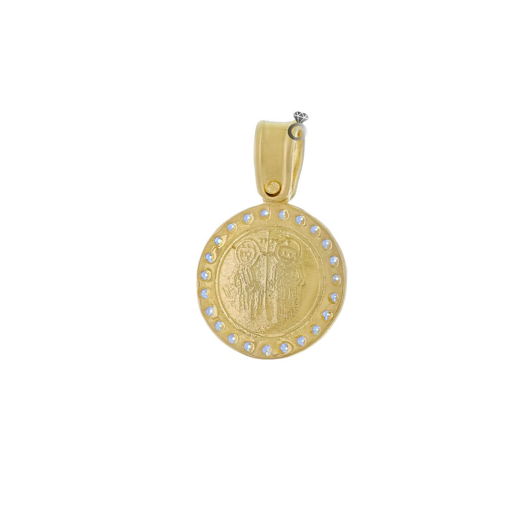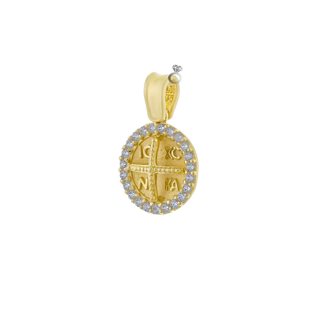 Χρυσό φυλαχτό Κωνσταντινάτο δύο όψεων, συνδυασμός γυαλιστερών & ματ επιφανειών . Στιβαρή μασίφ κατασκευή από χρυσό 9 καρατίων & ζιργκόν .