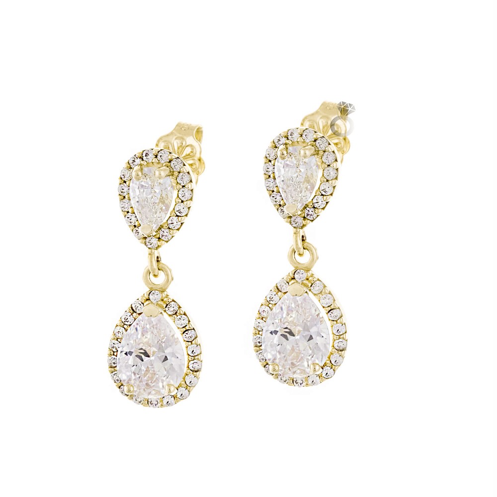 Χρυσά σκουλαρίκια 14 καρατίων , με λευκά ζιργκόν . Σκουλαρίκια για πολύ εντυπωσιακές εμφανίσεις , ιδανικά για νύφες .