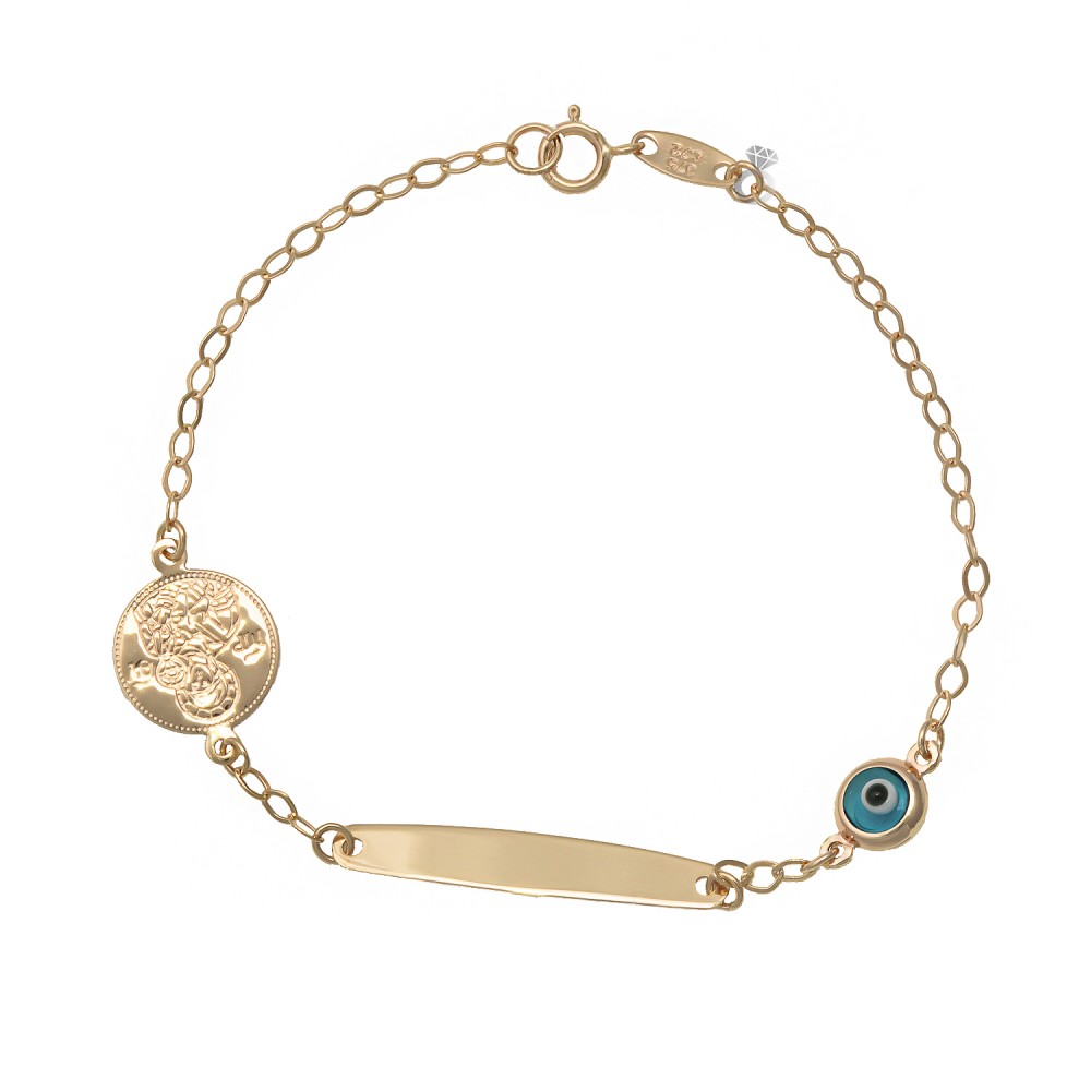 Παιδική ταυτότητα χρυσή 9 καρατίων με φλουρί δύο όψεων , παναγίτσα από την μία όψη και κωνσταντινάτο από την δεύτερη , καθώς και ματάκι .