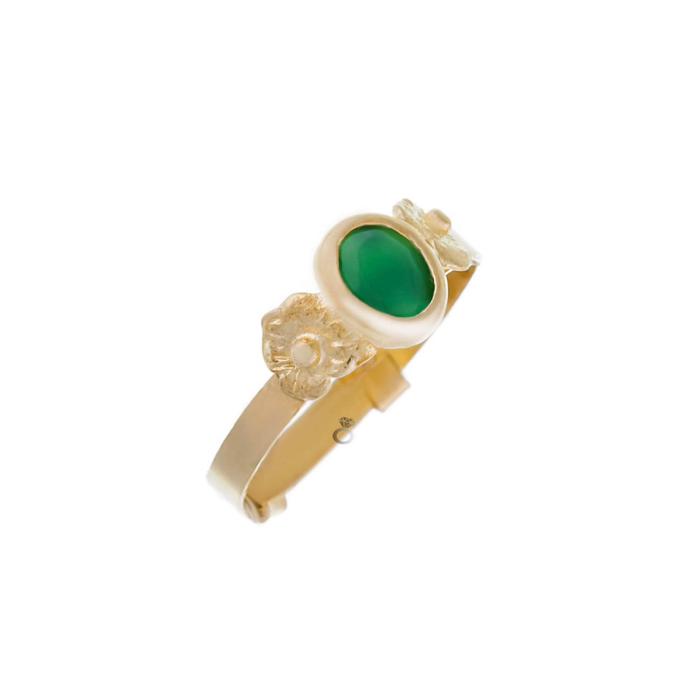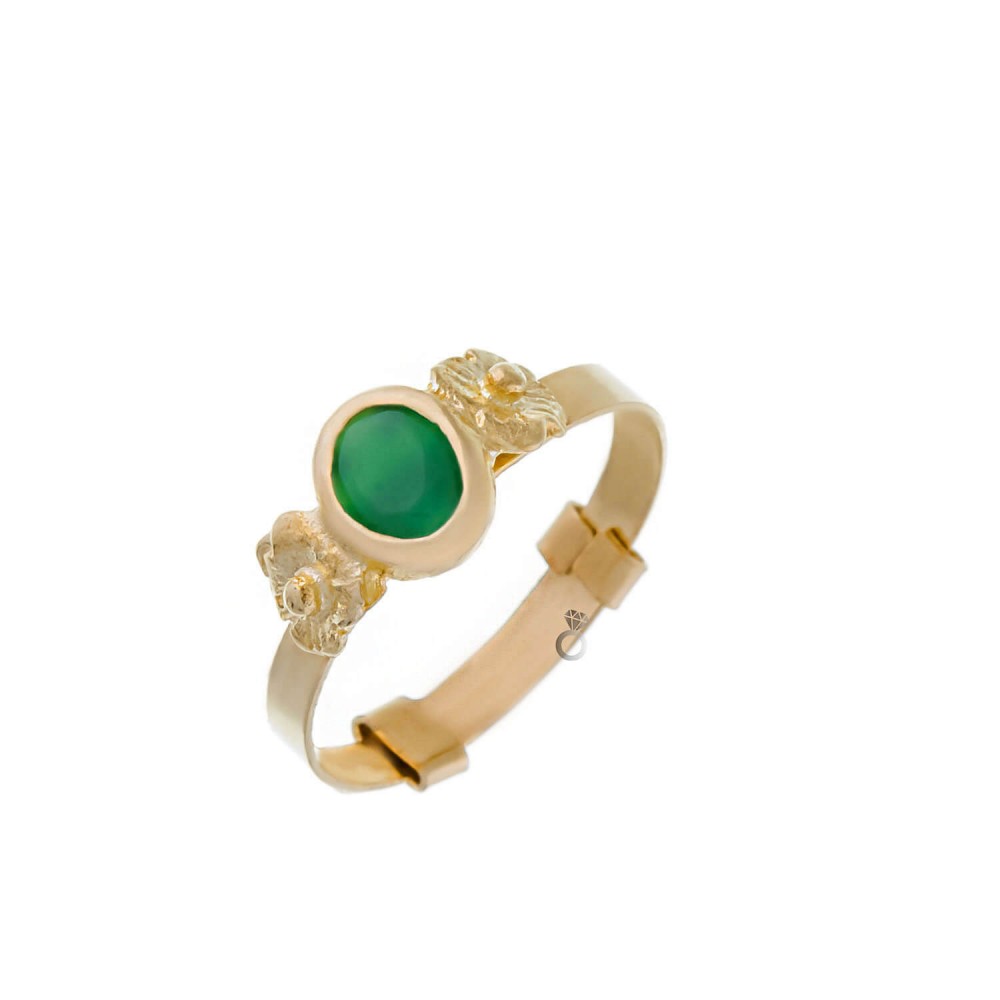 Δαχτυλίδι χρυσό , 14 καρατίων , με πέτρα σμαραγδίτη . Το δαχτυλίδι προσαρμόζεται εύκολα στο νούμερο του παιδικού δάχτυλου , χάρη στην ειδική κατασκευή που σας βοηθάει να το μεταβάλετε μόνοι σας .