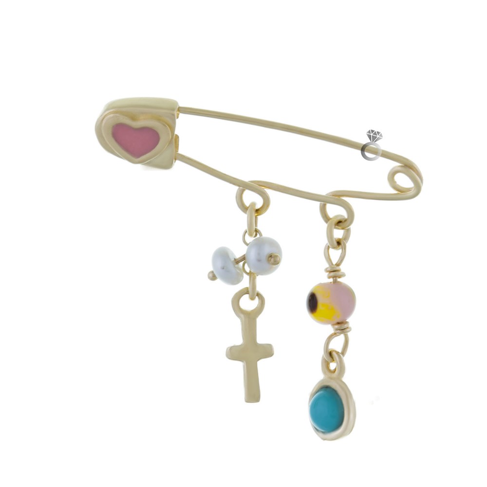 Χρυσή παραμάνα , 14 καρατίων , με καρδιά από σμάλτο , ματάκι , πέτρα τυρκουάζ , σταυρουδάκι & μαργαριτάρια .