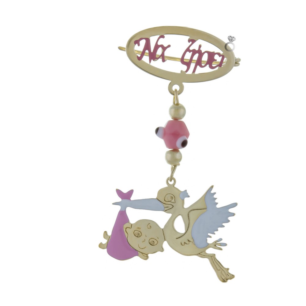 Χρυσή παραμάνα , 9 καρατίων , με ματάκι σε ροζ χρώμα , επιγραφή ''Να Ζήσει'' & πελαργό με μωρό με λεπτομέρειες σμάλτου .