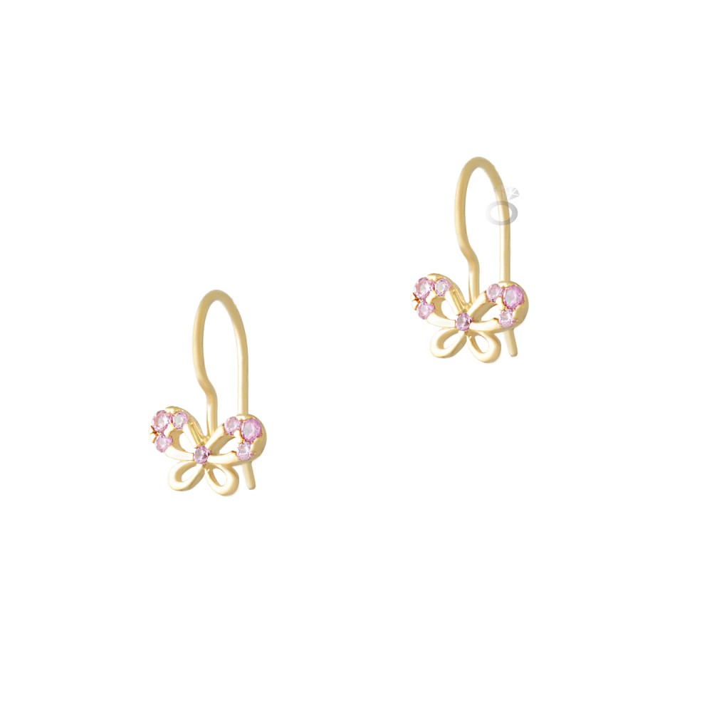 Παιδικά χρυσά σκουλαρίκια πεταλούδες , 9 καρατίων , με ροζ πέτρες .