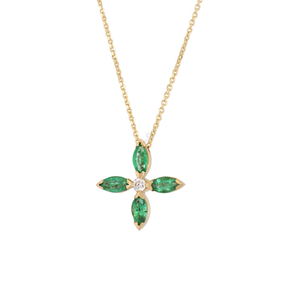 Γυναικείο κολιέ σταυρός , κατασκευασμένο από χρυσό 18 Καρατίων με ορυκτά σμαράγδια και διαμάντι κοπής Brilliant.