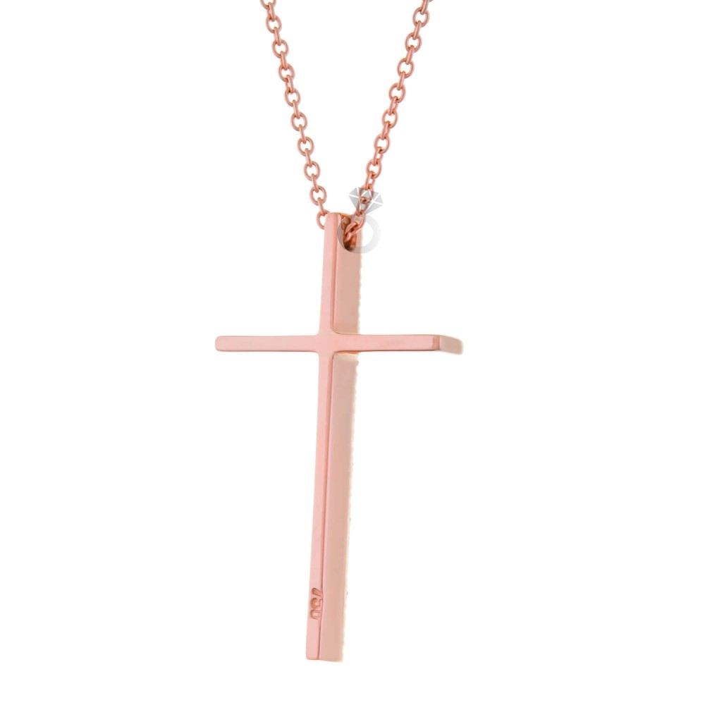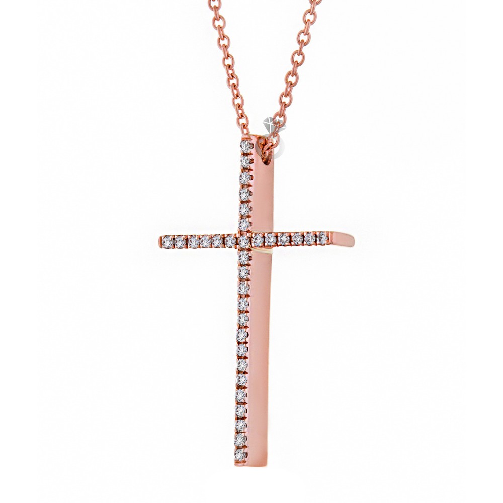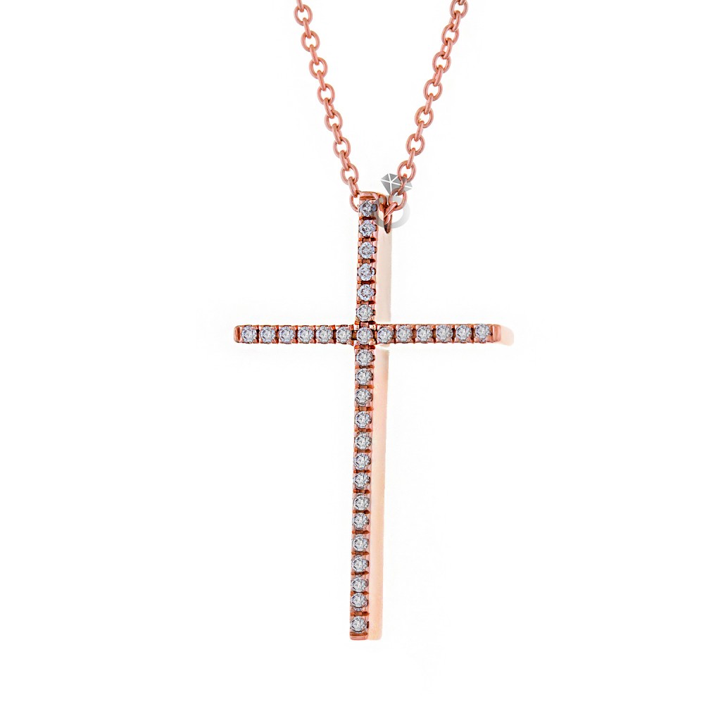 Γυναικείος σταυρός , σε ροζ χρυσό 18 καρατίων , με Διαμάντια κοπής μπριγιάν . Συνοδεύεται από ροζ χρυσή αλυσίδα 18 καρατίων .
