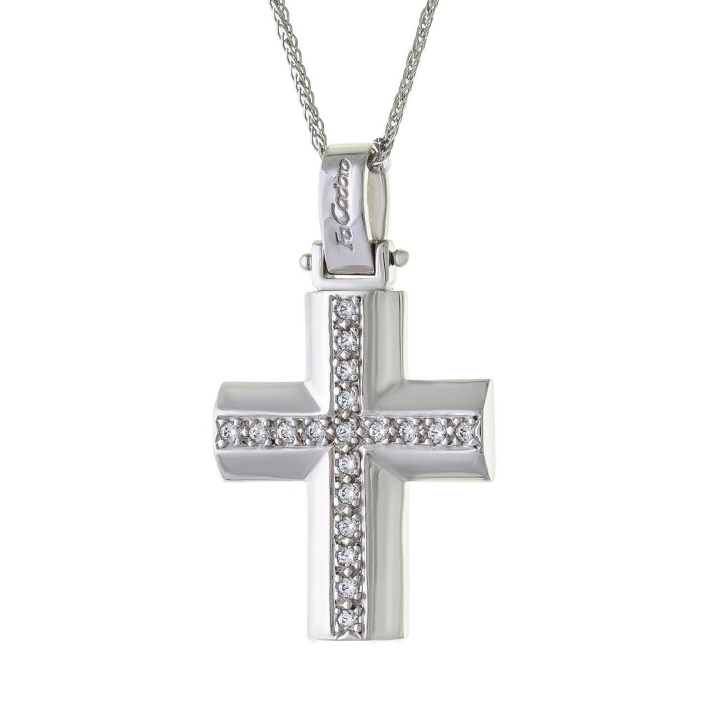 Λευκόχρυσος σταυρός 14 καρατίων σε κλασσικές γραμμές από την Facad'oro , με πέτρες ζιργκόν και γυαλιστερές επιφάνειες  .