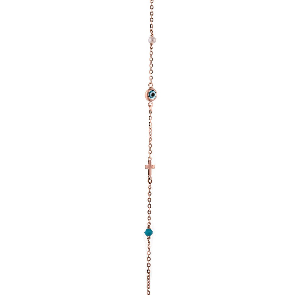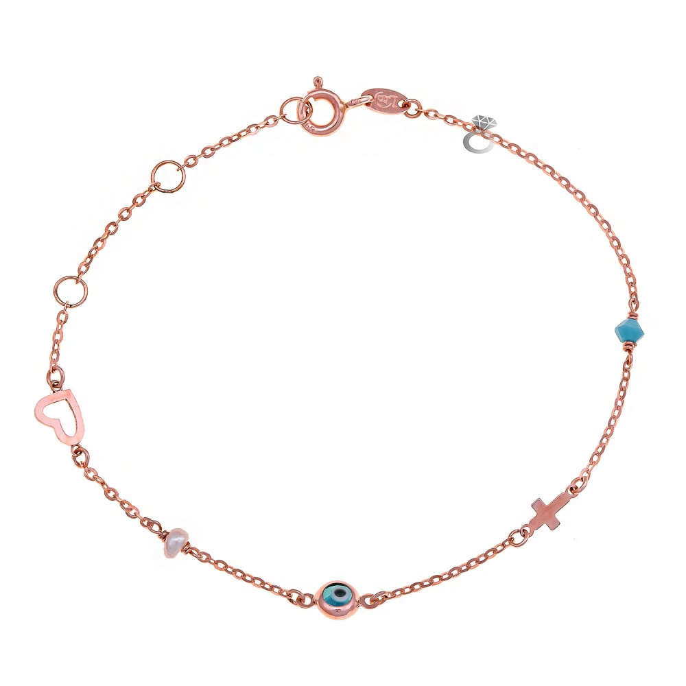 Ροζ χρυσό βραχιόλι με στοιχεία περιμετρικά καρδιά , μαργαριτάρι , μάτι , σταυρουδάκι και τυρκουάζ.