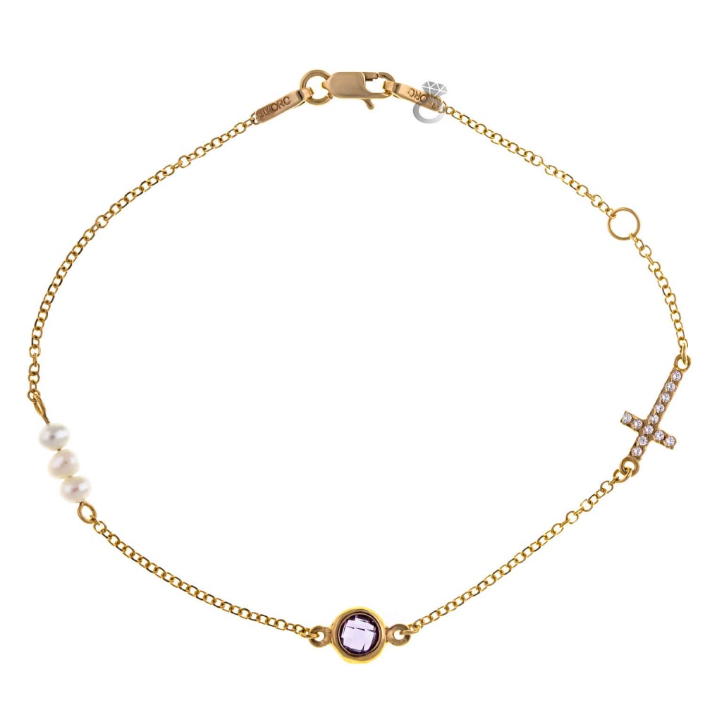 Χρυσό βραχιόλι 14 καρατίων με μαργαριτάρια , σταυρό με ζιργκόν και μωβ ζιργκόν .