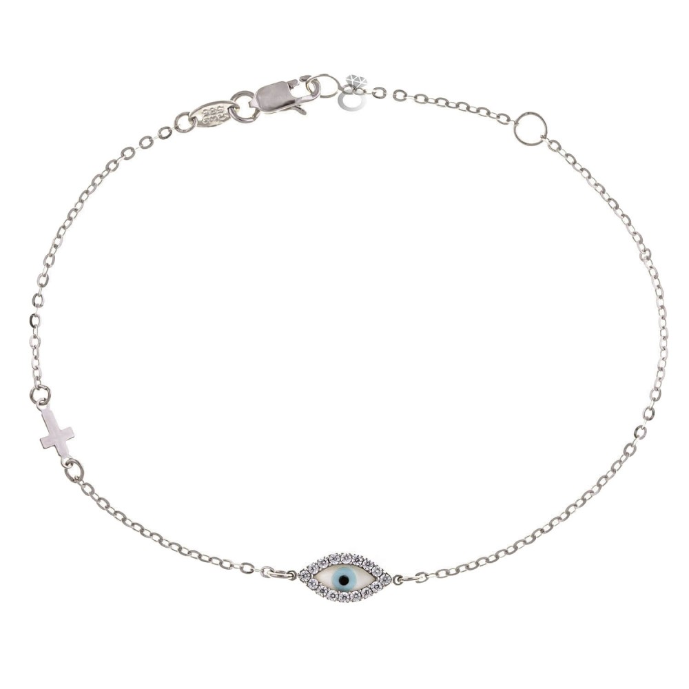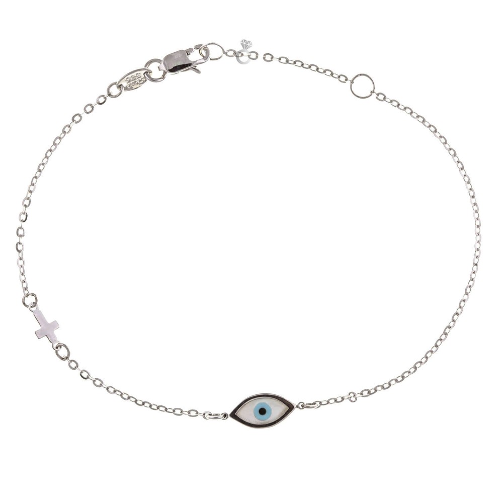 Λευκόχρυσο βραχιόλι 14 καρατίων με μάτι και σταυρό. Δύο όψεων , πρώτη με πέτρες και δεύτερη χωρίς πέτρες .