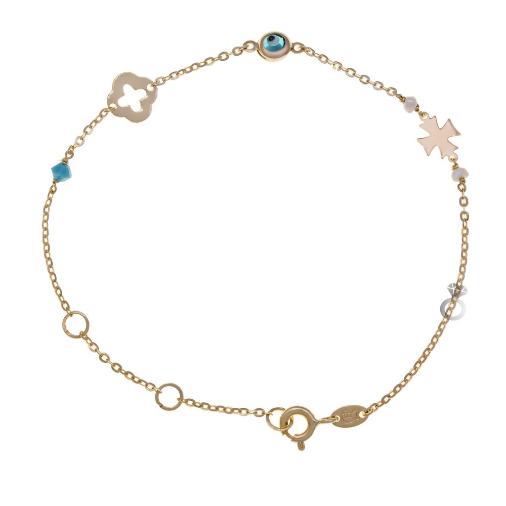 Χρυσό βραχιόλι με στοιχεία περιμετρικά σταυρό , μαργαριτάρι , μάτι , σταυρουδάκι και τυρκουάζ.